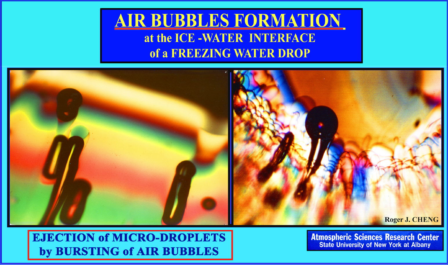 MICRO-DROPLETS WERE EJECTED BY THE BURSTING OF AIR BUBBLES RELEASED FROM A MELTING ICE PELLET OR HAIL, MORE THAN 500 AIR BUBBLES WITH AN AVERAGE DIAMETER OF 50 MICRONS WERE OBSERVED TO BE RELEASED FROM A HALF-MELTED 1 MM ICE PELLET.